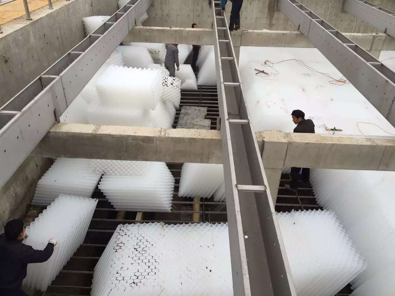 蜂 蜂窩狀填料主要有六角蜂窩填料和波紋板狀填料兩種形式。 2.5.1.1 六角蜂窩填料 (1)簡介 六角蜂窩填料如圖2-2所示,這種填料是經(jīng)許多條直六角管組合成型的塊體,有斜管和直管兩種形式,材質(zhì)有聚丙烯(PP)、聚氯乙烯(PVC)、乙丙共聚和玻璃鋼(FRP)四種。斜管主要應用于沉淀和除砂作用。具有濕周大、水力半徑小、處理效率高、占地面積小、層流狀態(tài)好、顆粒沉降不受紊流干擾等特點。組裝的主要優(yōu)點有:韌性強、組裝強度好、不變形、不脆裂、使用壽命長、抗老化期在原聚丙烯填料3~5年的基礎上可延長5~8年的使用壽命,是近十年來在給排水工程中采用最廣泛而且成為一項水處理裝置。 主要用于水廠沉淀池,污水處理池、加速沉淀池和澄清池的水處理。也可用于進水口除砂,一般工業(yè)和生活給水沉淀、污水沉淀、隔油以及尾礦濃縮等處理,既適用于新建工程,又適用于現(xiàn)有舊池的改造,均能取得良好的經(jīng)濟效益。六角蜂窩填料具有沉淀速度快,減少沉淀時間到提高產(chǎn)水量和凈水效率出水水質(zhì)好,是水廠及污水處理工程挖潛改造的一種有效途徑。其中直管主要用于生物濾池的高負荷生物濾池、塔式生物濾池、淹沒式生物濾池(又稱接觸氧化池)以及生物轉(zhuǎn)盤的微生物載體,可對工業(yè)有機廢水和城市污水進行生化處理。