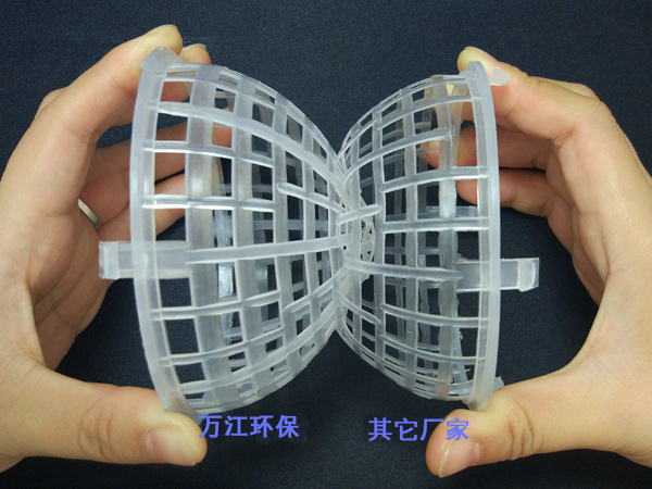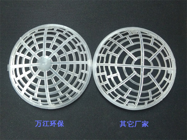 該填料系列由聚丙烯材料注塑而成,分內外雙層球體,外部為中空魚網狀球體,內部為旋轉球體。主要起生物膜載體的作用,同時兼有截留懸浮物的作用。該產品具有生物附著力強、比表面積大、孔隙率高、化學和生物穩定性好、經久耐用、不溶出有害物、不引起二次污染、防紫外線、抗老化、親水性能強等特點。在使用過程中,微生物易生成、易更換、耐酸堿、抗老化、不受水流影響、使用壽命長,剩余污泥少,安裝方便。